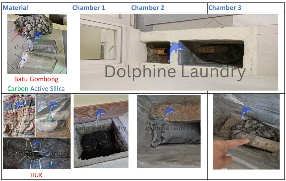 - Manajemen (manajer operasional) membuat 3 atau 4 chamber pengolahan air limbah cucian dengan minimal 3 tahapan filtrasi :